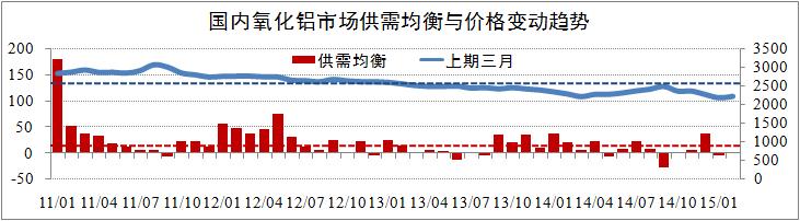 发稿时间:2015-04-09 市场供给方面,2015年1-2月,全国氧化铝市场供给分别为486万吨和445万吨,其中进口氧化铝合计70万吨,出现了较大幅度回落。近几年数据显示,进口氧化铝对国内氧化铝市场供给的贡献率基本稳定在9%左右,预计该贡献率将下降至7%左右。总体而言,国内氧化铝市场供需整体处于理论均衡状态,但上海期货交易所三月长单价与2570元/吨的均价出现了较大程度的偏离。