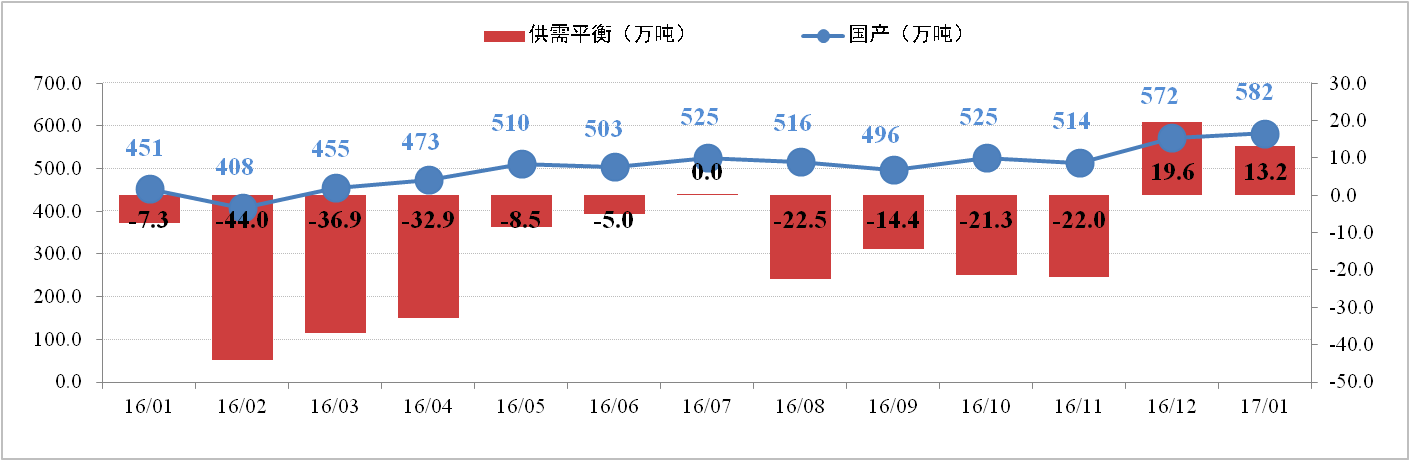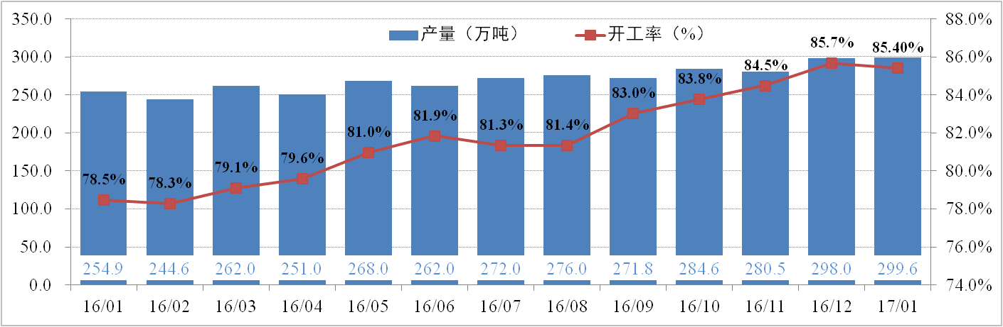 供给方面:2月10日,全国电解铝有效产能为4,226.6万吨,运行产能37万37.5吨,开工率为88.42%。其中,1月份电解铝总产量为299.6万吨,供应持续增加。调研数据显示,2017年电解铝新产能已投产98.1万吨,预计年度最终实现588.5万吨;电解铝复产21.2万吨,预计年内最终实现152万吨。