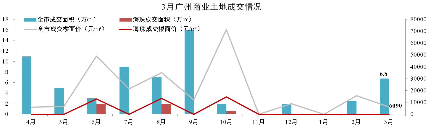 全市:3月共成交3宗商业地块,成交面积6.8万㎡,成交楼面价6,090元/m2,琶洲区域暂无土地成交。