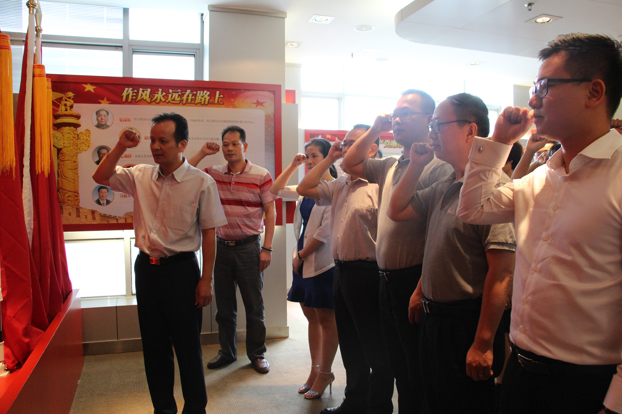 7月1日上午,PG电子集团党委在江高生产基地办公大楼举行了纪念建党95周年系列活动暨党建活动室揭牌仪式。江高镇党委组织人事办主任黄永强、集团党委书记夏文锋、副书记蔡晓强、第一及第二党支部党员出席了本次活动。