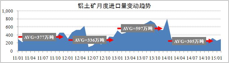 自2014年2月以来,我国铝土矿进口量增长一直保持在较低水平。监控数据显示,2015年1-2月份进口量分别为260万吨和300万吨,预计进口量水平基本与2014年保持一致,全年月度平均进口305万吨。当期,山东宏桥、中铝国贸和信发铝业成为主要进口企业,进口量合计占比85%;澳大利亚、印度和马来西亚则是主要进口原产地,当期合计占比高达91%。