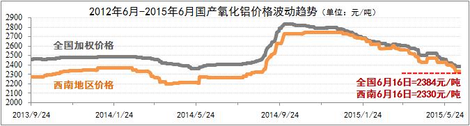 国产价格走势偏弱。上半年国产氧化铝价格维系了年初下滑的基本趋势。截至6月16日,全国氧化铝加权均价为2384元/吨,西南地区价格与全国加权均价的价差缩小至近50元/吨,同期均价为2330元/吨。其中,贵州均价为2340元/吨,略高于西南地区均价。从市场实际成交表现上看,虽然目前国产氧化铝市场逐步恢复至去年平均水平,但在铝价不景气的环境下,氧化铝市场价格难以坚挺。