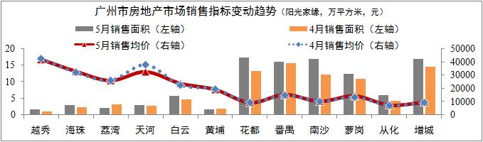 住宅销售市场企稳回升。网签数据:5月份广州市住宅销售套数为8735套,环比增长17.2%;销售面积为102.37万平方,环比增长22.3%;销售均价为14232元/平方,环比小幅下降2.1%。