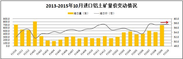 目前,全国铝土矿进口市场依然呈现出量价齐升的基本趋势。统计数据显示,今年9月份我国进口铝土矿681万吨,环比增长749%,同比增长139%。价格方面,进口均价上浮至57.6美元/吨,环比小幅增长0.5%。从原产地分布上看,我国进口铝土矿主要分布在马来西亚、澳大利亚和印度等三个铝土矿资源储量丰富的国家。虽然今年以来氧化铝市场受到铝价持续低迷的拖累,但是氧化铝企业并未因此减产,全年预期产量保持了相对稳定,对进口铝土矿的需求依旧强劲。