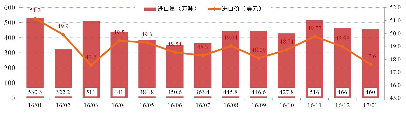 进口量方面:根据进口海关数据显示,2017年1月我国进口铝土矿460万吨,同比下降11.74%,环比微降1.39%。当月澳洲、几内亚、马来西亚等主要国家供应基本稳定。