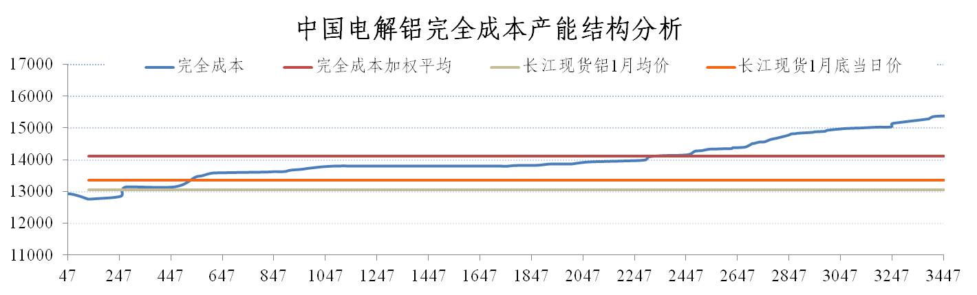 电解铝生产成本方面。电解铝生产成本呈现稳中微降态势。2月份全国电解铝加权平均完全成本 13794 元/吨,较1月份上升166元/吨。2月电解铝成本仅小幅上升,而月内铝价在政策指引下表现强势。从绝对数字对比来看,电解铝企业亏损情况本月有所缓解;完全成本来看,全行业吨铝月均理论亏损 137元。整体来看,电解铝企业成本有回落的趋势。据了解,目前山东铝企外购煤炭价格已经出现明显下滑,对自备电厂企业成本影响显著,加之氧化铝调整趋势不改,预计3月电解铝企业整体成本将下降。