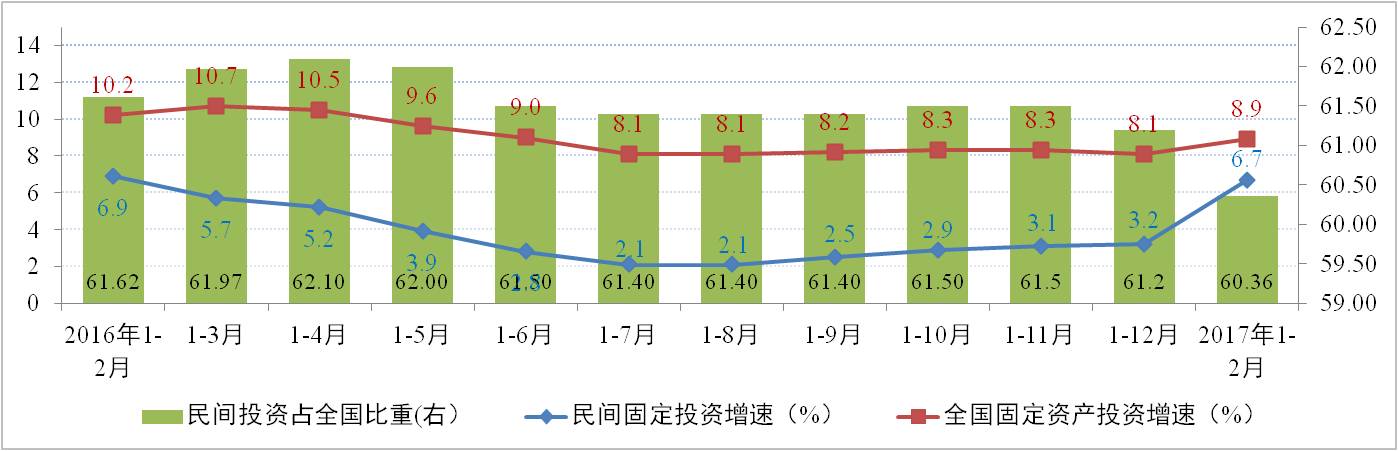 据国家统计局统计数据显示,2017年1-2月全国固定资产投资完成额度为4.14万亿元,同比增长8.9%,增速比去年全年提高0.8个百分点。其中,民间固定资产投资额为2.98万亿元,同比增速为6.7%,增速创11个月新高;较去年全年提高3.5个百分点,连续第7个月增速环比提升。