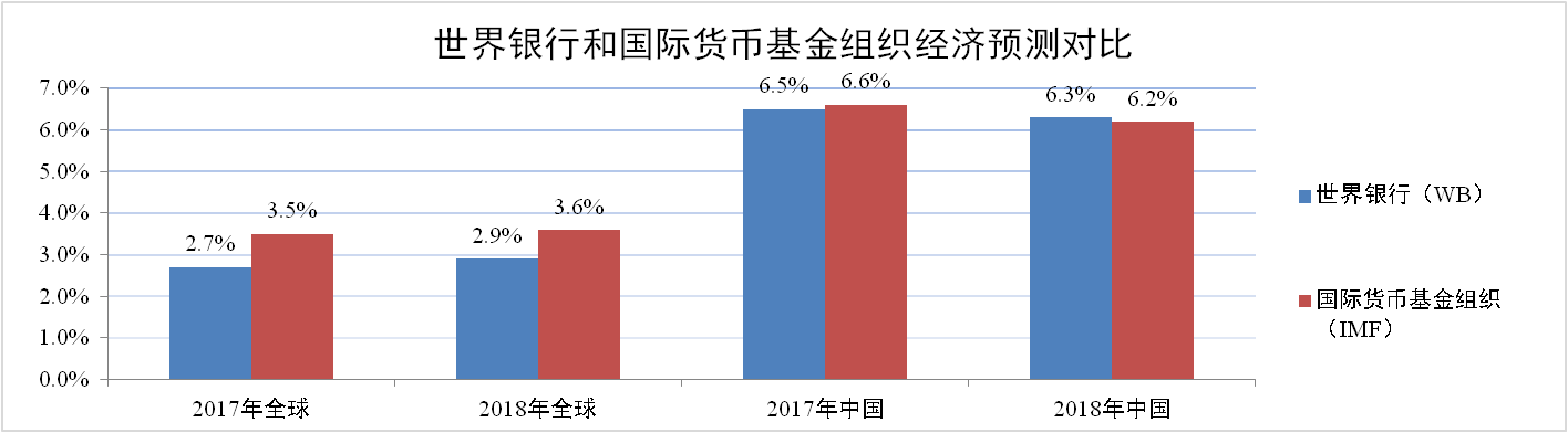 世界银行2017年6月《全球经济展望》数据显示,随着制造业和贸易回暖以及大宗商品价格趋稳,预计2017年和2018年全球经济增速分别为2.7%和2.9%;发达经济体经济增速分别为1.9%和1.8%;新兴市场和发展中经济体经济增速分别为4.1%和4.5%;中国经济增速分别为6.5%和6.3%。