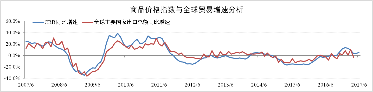 分析认为:本次全球贸易增速的提升更多的取决于商品价格增速。历史数据表明商品价格指数总体上领先全球贸易增速约一个季度。目前商品价格增速已回落至低位企稳,表明全球商品价格已经阶段性见顶,全球贸易回暖增速或回落。