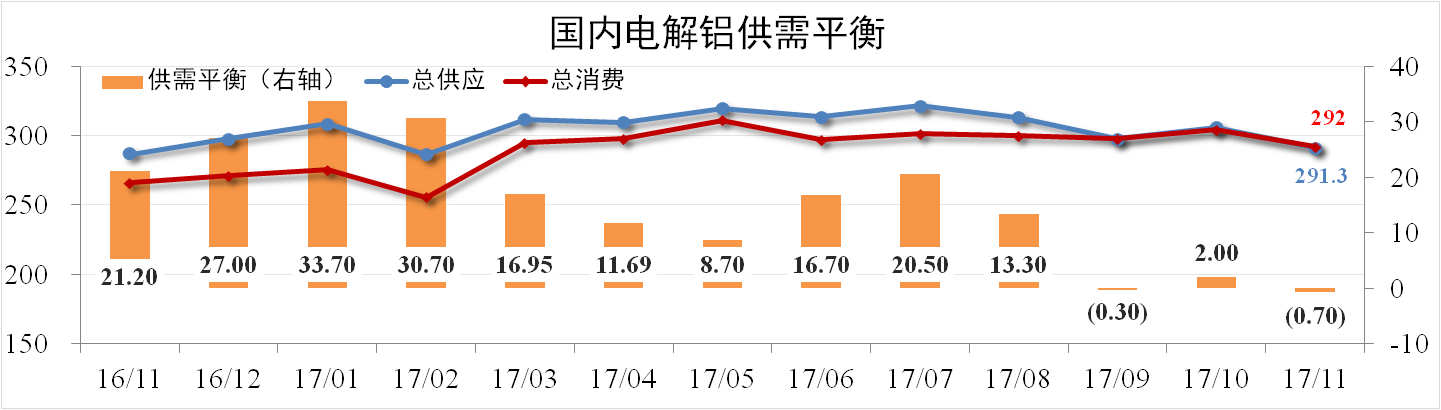 据阿拉丁数据,11月份我国电解铝产量291万吨,同比上涨1.43%,环比下跌4.8%。净进口0.3万吨,总供应量291.3万吨,总消费量292万吨,从静态数据看,当月理论供应短缺0.7万吨。