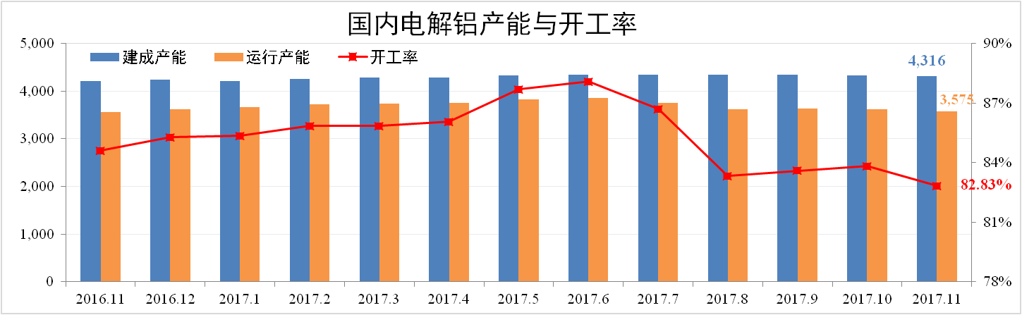 11月份中国电解铝总产能4,316万吨,运行产能3,575万吨,开工率82.83%,其中运行产能环比下降1.4%。据百川资讯统计,截至12月7日,2017年中国电解铝累计已减产494.8万吨,已确定待减产19.7万吨,年内累计已复产143.8万吨。