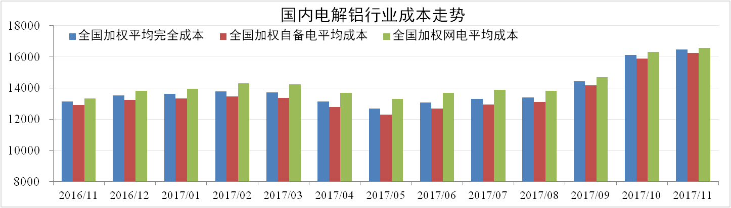 分析认为:氧化铝行业减产后市场仍需时间消化过剩库存,氧化铝价格将持续走弱。电解铝实际减产不及预期,阳极供应紧张价格坚挺,另外部分地区燃煤供暖回归,煤炭价格大涨,综合来看预计12月电解铝成本仍会上涨。