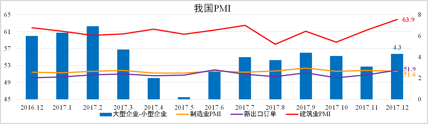 12月我国制造业PMI为51.6,较上月下滑0.2个百分点。其中,出口订单继续上升至51.9,显示外需保持强势;大企业与小企业之差有所扩大,表明在环保压力下大型企业达标能力强;另外,建筑业意外录得63.9的高位。