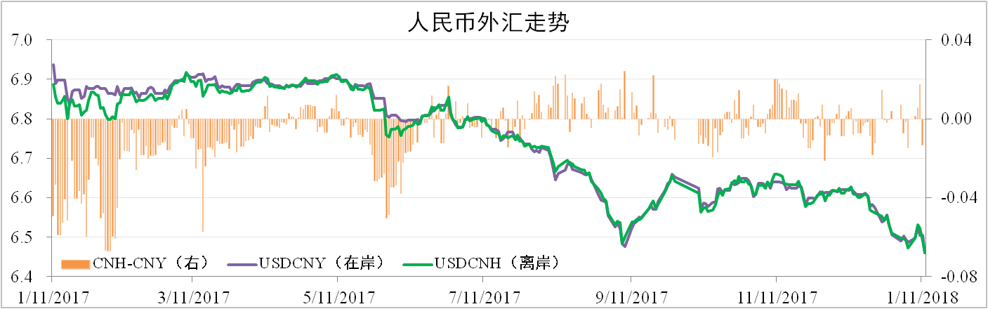 人民币近期大幅上涨,截止2018年1月12日,在岸人民币汇率为6.4606,环比升值2.43%,离岸人民币汇率为6.4605,环比升值2.51%。1月9日央行通知部分中间价报价行对逆周期因子进行调整,调整后相当于无逆周期调节。