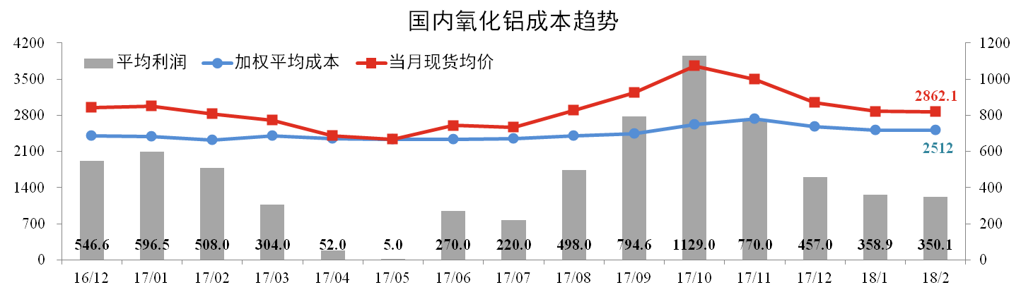 分析认为:二月份煤炭价格冲高回落,但幅度较小对成本影响不大。烧碱价格在恢复性回调后出现明显上涨,将推升3月份氧化铝成本。而氧化铝价格整体上行动力不足,预计3月份氧化铝利润继续收窄。