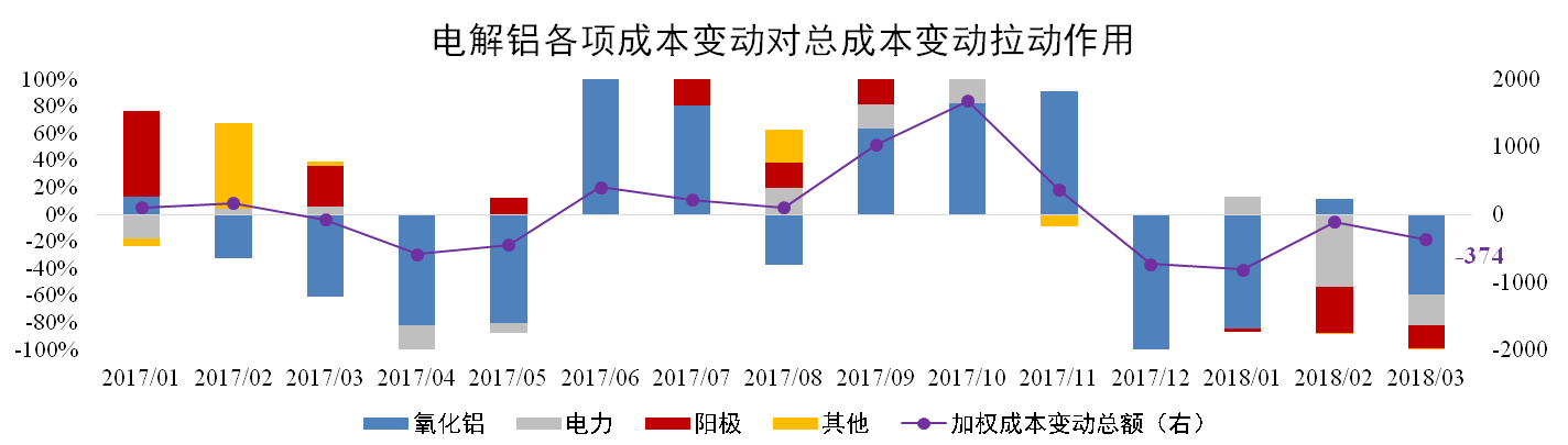 分析认为:3月氧化铝价格受基本面及政策主导价格下降,煤炭供应宽松,煤企主动下调价格致使电力成本继续下跌,阳极复产加快供应过剩拖累价格进一步下滑,预计电解铝成本仍将延续下降趋势。