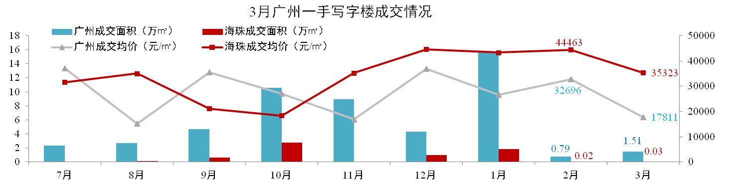 3月,广州一手写字楼成交1.51万m²,环比上升23%,成交均价17,811元/m²,环比下跌36%。其中海珠区成交0.03万㎡,环比上升50%,成交均价35,323元/㎡,环比下降21%。