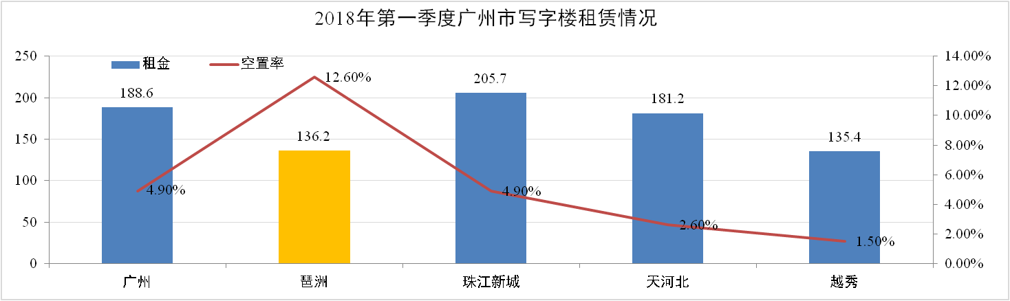 根据戴德梁行《2018年广州市第一季度写字楼速递》报告,2018第一季度广州市甲级写字楼租金为188.6元/㎡/月,环比上升3.9%;琶洲市场平均租金136.2元/㎡/月,环比上升4.9%。全市空置率为4.9%,琶洲空置率为12.6%。