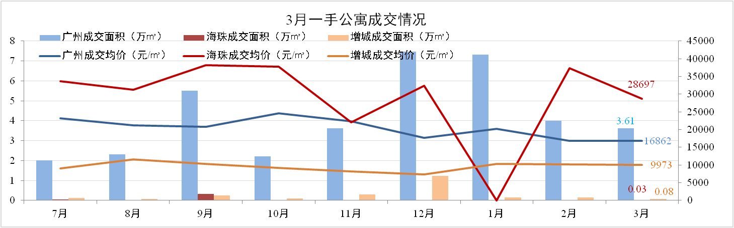 3月广州一手公寓成交600套,成交面积3.61万㎡,环比下跌0.3%。全市成交均价16,862元/㎡,环比上升2%。海珠、增城两区成交量式微,价格保持稳定。