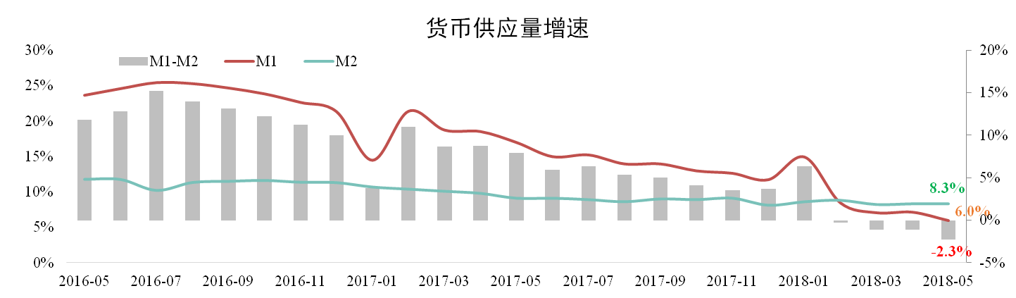 发稿时间:2018-06-22据人民银行数据,5月份M1增速为6.0%,较上月下降2.3个百分点,创两年新低。M2增速为8.3%,与上月持平。剪刀差为-2.3%,连续4个月为负,说明货币活力有所下降,实体经济流动性偏紧。