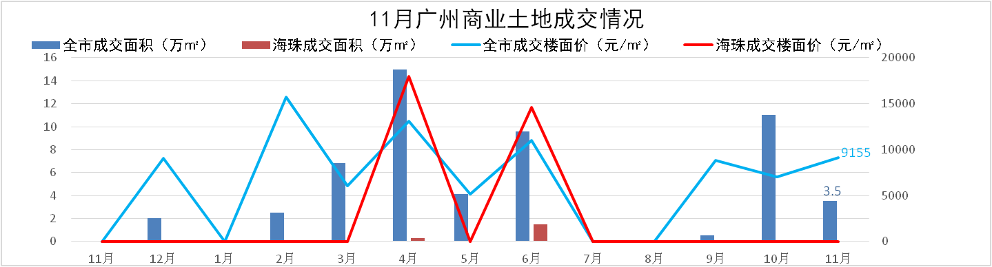 全市:11月共成交2宗商业地块,成交面积3.5万㎡,成交楼面价9,155元/m2,无溢价;琶洲区域暂无土地成交。