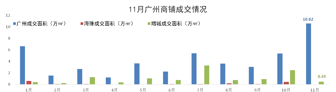 11月,广州一手写字楼成交4.97万m²,环比增加22%;其中海珠区一手写字楼成交0.05万m²,环比减少74% 。
