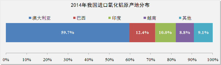 进口方面。2014年度我国进口氧化铝共528万吨,进口同比增长37.7%。从原产地上看,全年最大进口国仍为澳大利亚,进口氧化铝占比59.7%;前四位原产地氧化铝进口占比高达90.9%。进口价格方面,全年进口氧化铝均价为382.34美元/吨,折合人民币均价2343元/吨。