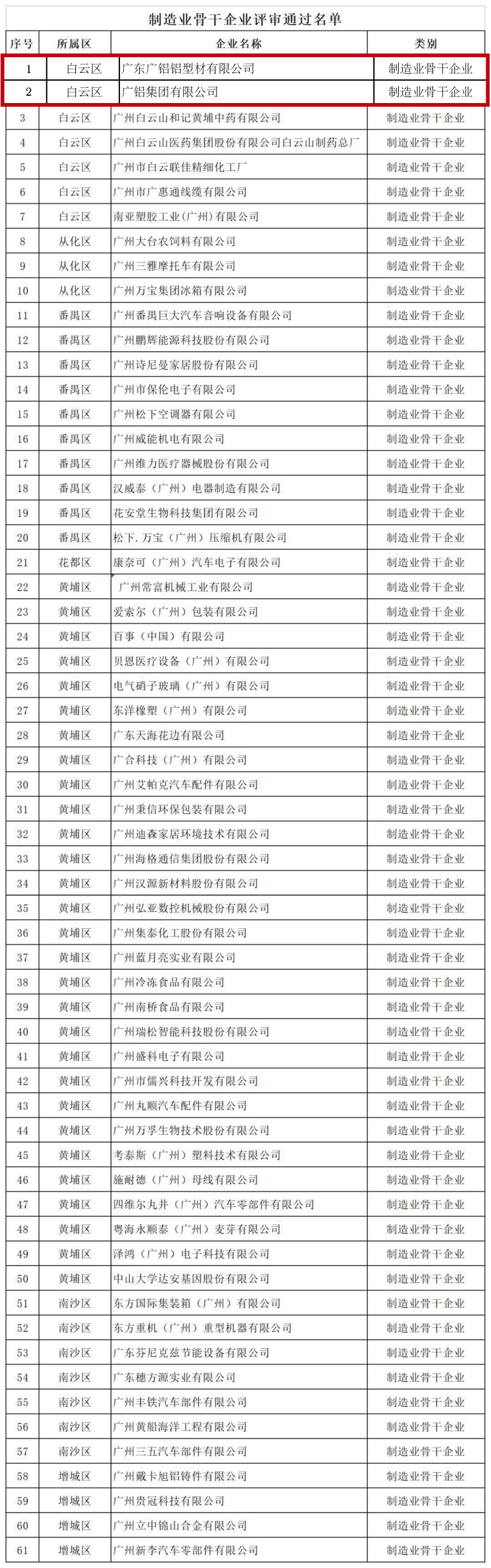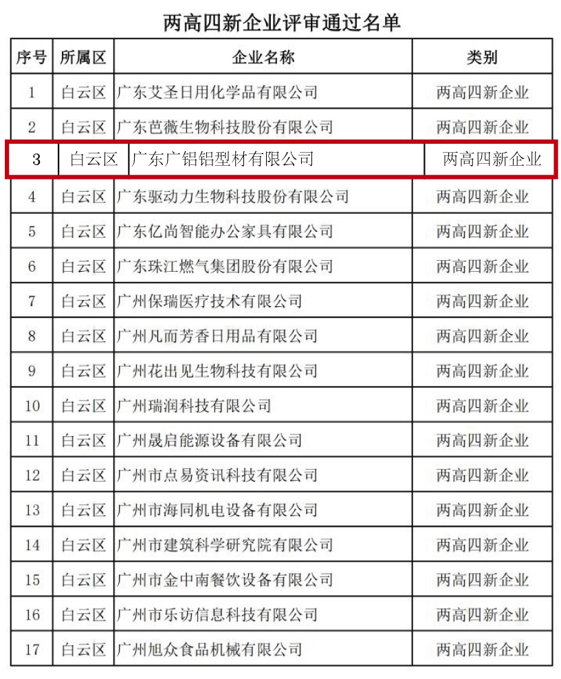 发稿时间:2019-03-01日前,广州市工业和信息化委员会公布了“三个一批”企业入库名单(第二批):制造业骨干企业61家、两高四新企业375家、小升规培育企业712家。PG电子集团入选为“制造业骨干企业”,广东PG电子铝型材有限公司分别入选为“制造业骨干企业”、“两高四新企业”。