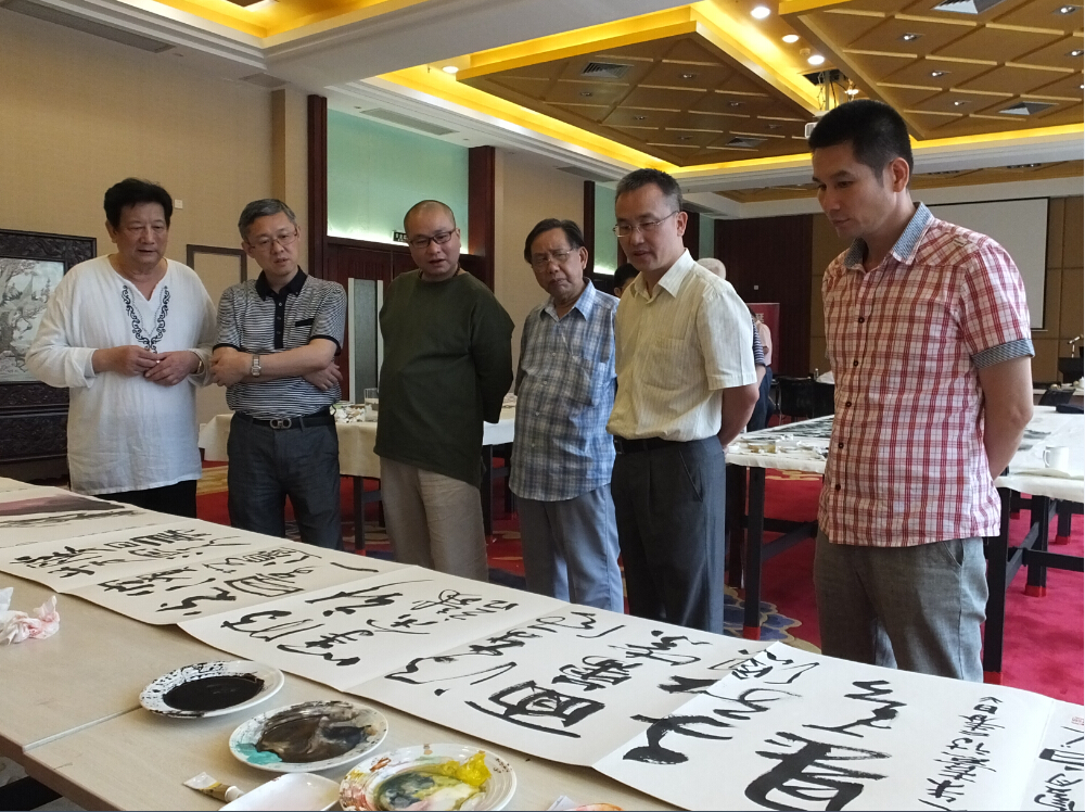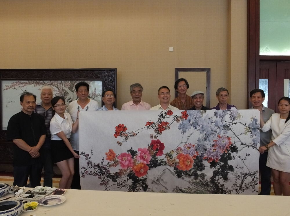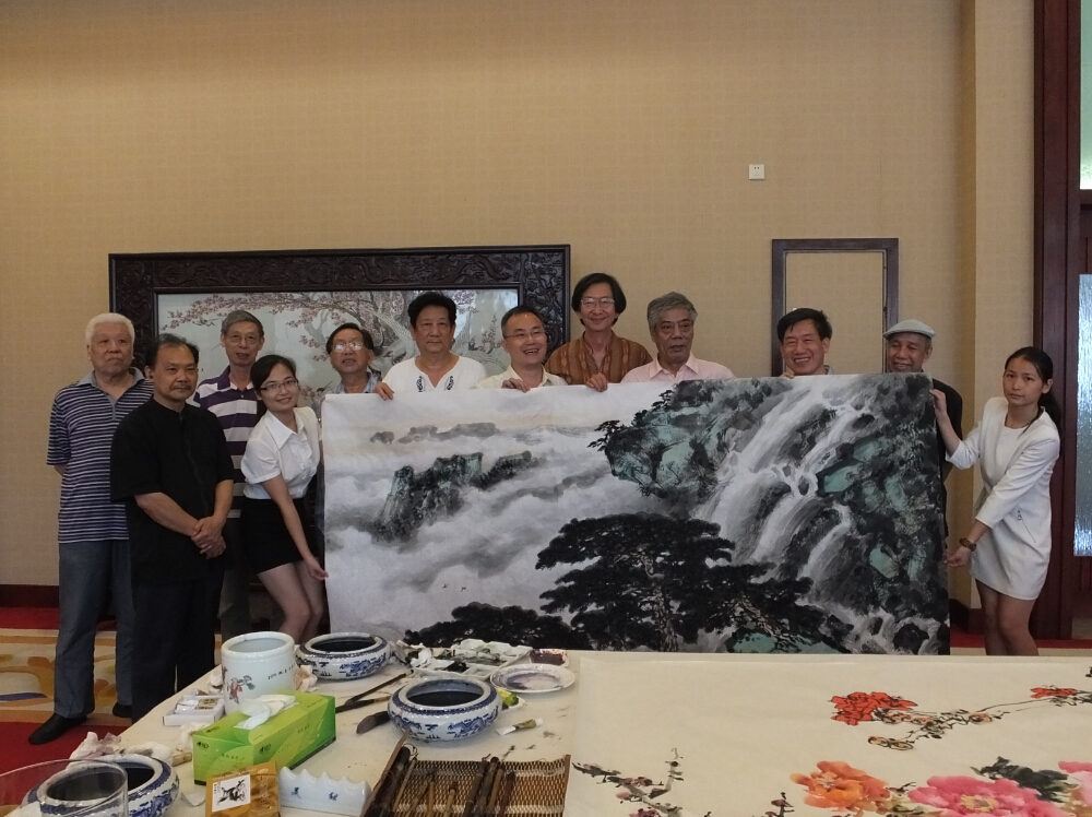 在广州画坛,李筱孙、叶泉、许固令、陈永康、卢德平、招炽挺、黄树文、陈永锵、陈孝能九位画家常常在一齐谈艺论道,因而被行内人雅尊为“羊城九老”。几十年来,九位画友一直以文会友,以画交心,情谊深厚。此次“羊城九老”应邀光临PG电子集团总部,叶鹏智董事长盛情接待了他们,并就集团的发展历史、经营战略、企业文化向他们做了介绍;叶董事长还与他们一起用餐、座谈。随后“羊城九老”便在展厅里谈笑风生、吟诗作对并联手作画赠予公司留作纪念。其画虽由九人联手所作,却犹如出自一人之手,浑然天成,气势不凡,可见他们的画艺是何等精湛、情谊是何等深厚!九位画坛耆英年纪虽已过半百,但他们依旧笑笑闹闹,直言不讳,童心未泯,表现出艺术家对待人生的乐观旷达。
