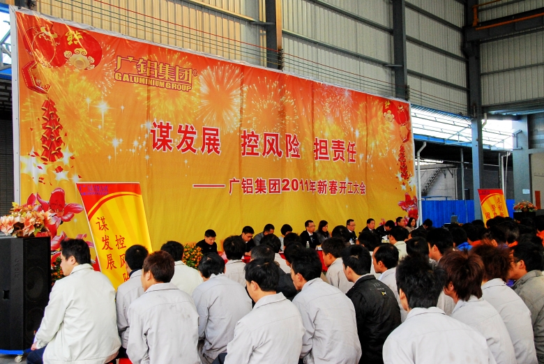 一、开工会议:8:30时主持人王副总裁宣布开工大会正式开始,随后叶董事长作新春致辞并发表重要讲话:㈠ 回顾2010年工作,主要有五个工作亮点:第一、2010年集团公司铝材销售量突破了预期目标,创历史之最;第二、铝制品公司销售量同比增长60%,创历史新高;第三、科技公司在配件销售金额、新产品研发、技术服务及产学研相结合等方面也有着不错的表现;第四、铝木型材销售有了新突破;第五、2010年集团公司的员工收入、人均工资都有着较快的增长。㈡ 展望2011年,叶董事长提出如下要求:第一、集团公司各个事业部和各个直营公司要抓好今后五年发展目标和实施计划的编制;第二、集团公司把2011年定为“团队建设年”,重点将放在人才的选拔、培养和考评上面;第三、启动铝工业板块上市计划,打造一个大型的、规范的上市企业。同时强调要更新思维,迎接挑战,提升技能,自我增值,勇挑重担,承担责任。叶董事长精彩的致辞引来了现场一阵阵热烈的掌声,致辞后由叶董事长向2010年度优秀团队、优秀干部和优秀员工分别颁发了荣誉证书,最后公司高层领导为全体员工派发开工利是。